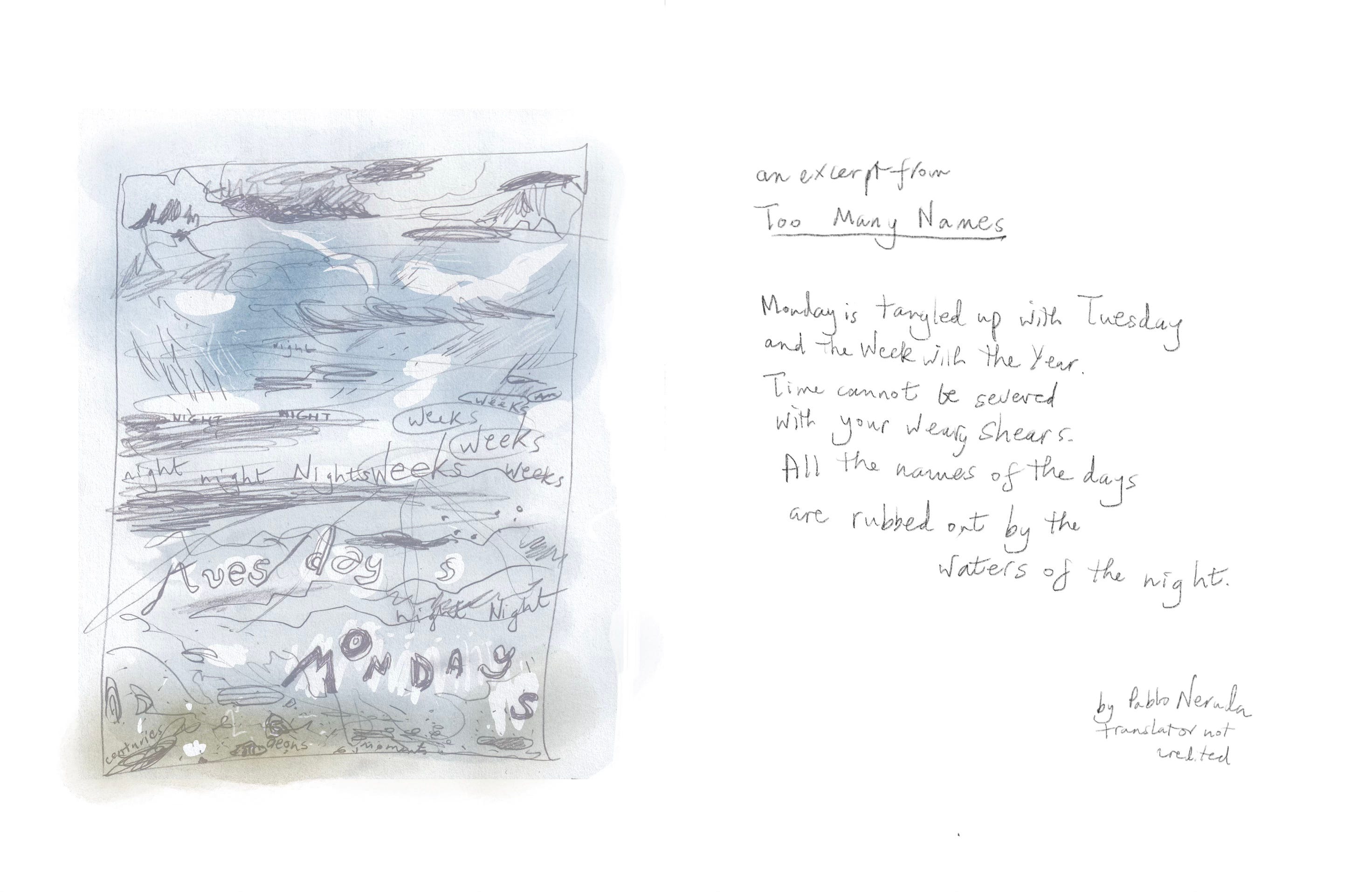 Today I came across a drawing I made back in July, but it was unexpectedly apt. I made the drawing in response to the prompt MONDAY which reminded me of Pablo Neruda’s poem Too Many Names (1958), here’s an excerpt: