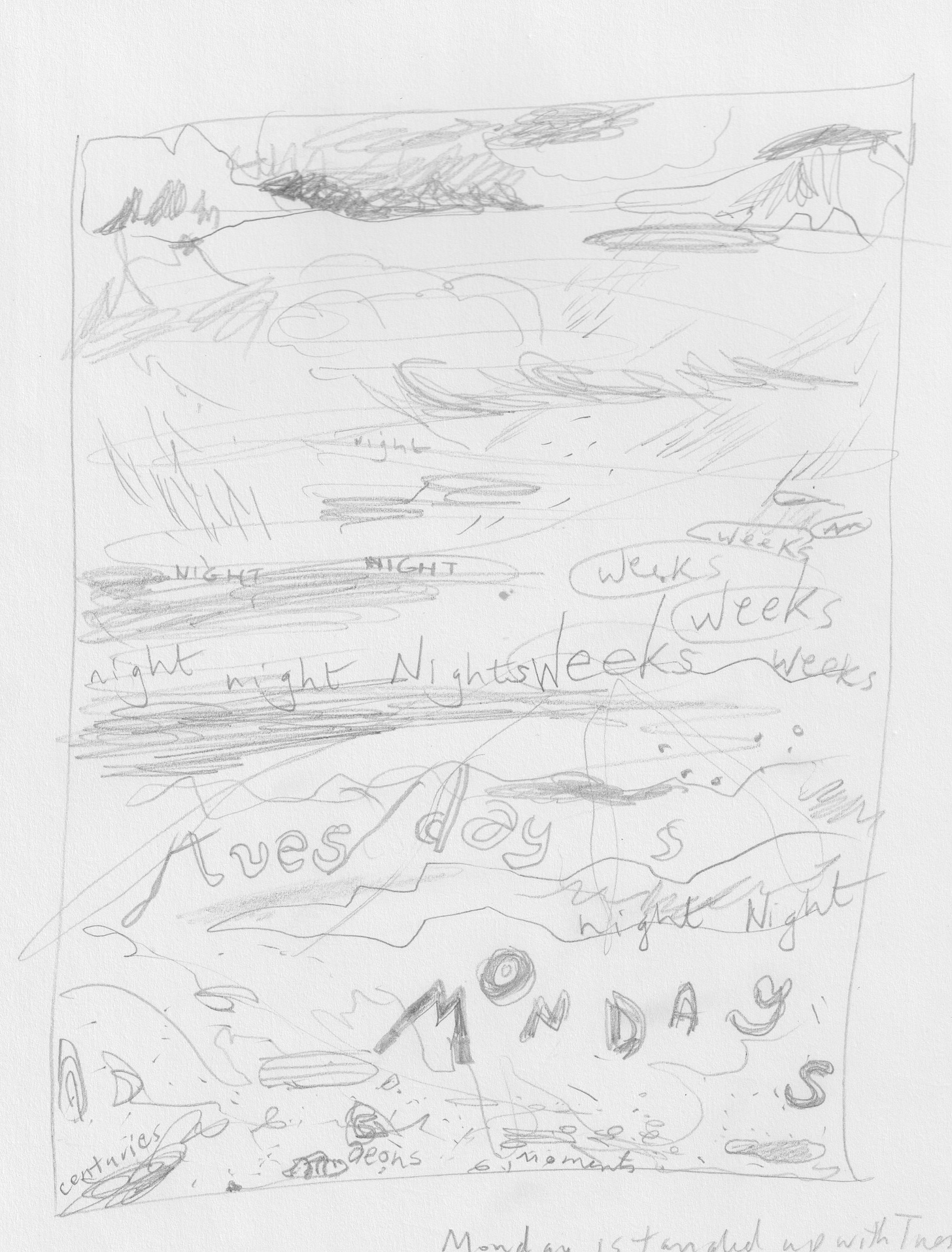 Monday is tangled up with Tuesday, and the week with the year. Time cannot be severed with your weary shears. All the names of the days are rubbed out by the waters of the night.